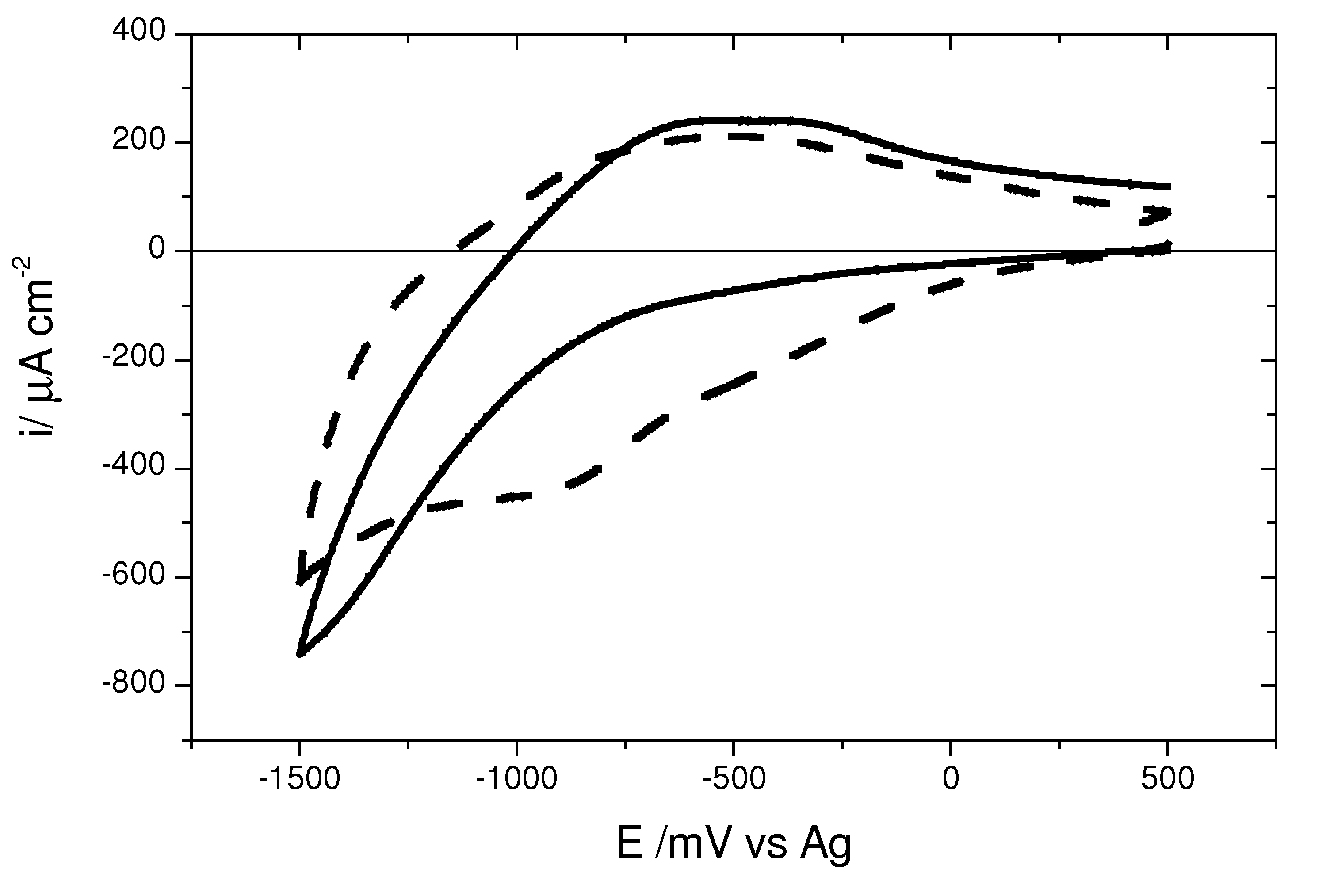 A Fig. 1 mostra os voltamogramas cíclicos de filmes de CeO2-TiO2 e CeO2-SnO2. As curvas caracterizam-se por um processo catódico, onde verifica-se um aumento de corrente até o potencial de inversão, seguido de um processo de oxidação (extração de Li+), que apresenta-se na forma de um pico largo. Comparando-se as respostas voltamétricas dos dois sistemas, observa-se que, o sistema CeO2-SnO2 também apresenta maiores valores de carga, 18,11mCcm-2 contra 9,91mCcm-2 do CeO2-TiO2. Outra observação importante, é que as regiões catódicas dos dois voltamogramas são bastante distintas, sendo que uma densidade de carga muito superior pode ser obtida com os filmes de CeO2-SnO2 a potenciais menores do que para os filmes de CeO2-TiO2.