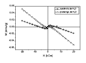 Figura 1: (a) representação da curva de magnetização completa para amostras preparadas na presença e na ausência de água; (b) porção central dos ciclos magnéticos.