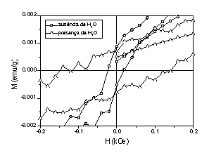O comportamento da magnetização (M) em função do campo magnético (H) foi estudado para amostras preparadas na presença e ausência de água. A Figura 1 (a) mostra a curva total de magnetização, sendo que os círculos representam a amostra preparada na ausência de água, e os triângulos a amostra preparada na presença de água. Na Figura 1(b) tem-se a representação da curva de forma ampliada. Observou-se, através das curvas de histerese, que o comportamento ferromagnético não aparece na amostra toda, tem-se também uma contribuição diamagnética sobreposta a curva ferromagnética, manifestada como uma linha reta de inclinação negativa de M(H). A adição de água aumenta o valor do campo coercivo, sendo que os valores para a amostra preparada na ausência e presença de água foram: 21 Oe e 130 Oe, respectivamente. Possivelmente este efeito está associado a uma variação do tamanho das cadeias poliméricas, uma vez que a reação dos cátions radicais com a água leva a reações de terminação de cadeia. Desta forma, o número de domínios ferromagnéticos por unidade de volume seriam maiores, levando a um aumento do campo coercivo da amostra.