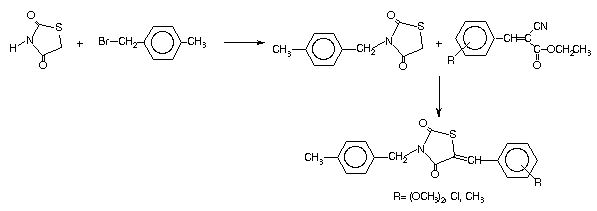 Os compostos 3-(4-metilbenzil)-5-(2,4-dimetoxiarilideno)-tiazolidina-2,4-diona (GQ-6), 3-(4-metilbenzil)-5-(3-cloroarilideno)-tiazolidina-2,4-diona (GQ-7) e 3-(4-metilbenzil)-5-(4-metilarilideno)-tiazolidina-2,4-diona (GQ-8) foram purificados, apresentando, respectivamente, rendimentos de 85, 65 e 43% e pontos de fusão de 161, 145 e 141ºC. Suas estruturas foram comprovadas por análises no infravermelho, por ressonância magnética nuclear protônica e por espectrometria de massa.