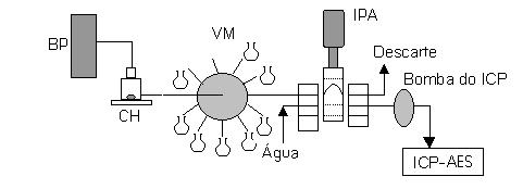 (VM) de 10 canais, da marca Valco, uma bomba peristáltica (BP)