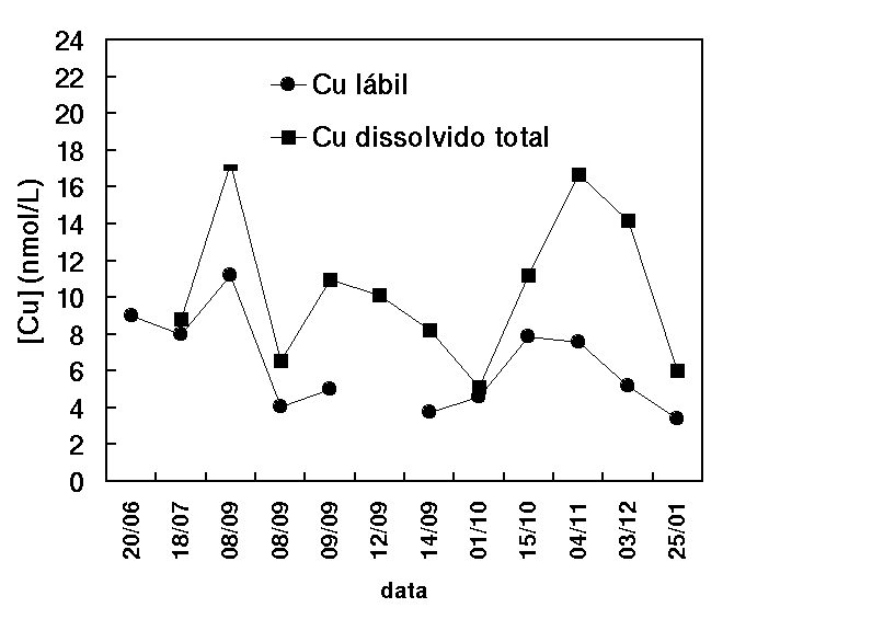 Figura 1: Concentrações de cobre lábil e cobre dissolvido total em amostras de águas de chuva coletadas de junho de 1999 a janeiro de 2000.