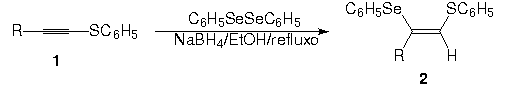 Nesta comunicação, apresentamos os nossos resultados sobre o estudo da adição do ânion fenil selenolato de sódio (gerado in situ) aos 1-tiofenil-2-organoil acetilenos 1 (Equação 1) que resultou na formação dos 1-selenofenil-1-organoil-2-tiofenil etenos de configuração Z representado pela estrutura 2.