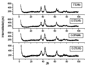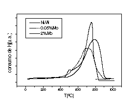 Nos resultados de TPR, (Figura 1), o perfil de redução alto e estreito, com máximo em 756ºC, característico da presença predominante do composto NiAl2O4 é substituído por perfis mais alargados, resultantes de uma maior distribuição de compostos com diferentes graus de estabilidade térmica. No TPR do composto com 2%Mo, um pico de menor intensidade em 500ºC é claramente observado, indicando a formação de uma fase de NiO de menor estabilidade térmica e outra de NiAl2O4 mais cristalina, que se reduz a temperaturas mais altas (790ºC), devido a uma possível interação de Mo com a alumina. Isto é confirmado pelos resultados de DRX (Figura2), os quais mostram um aumento de intensidade da banda de difração na posição de 2q em 36º e uma melhor definição da banda em 63º, que se separa em duas (63º e 66º) como consequência da melhor definição das duas fases.