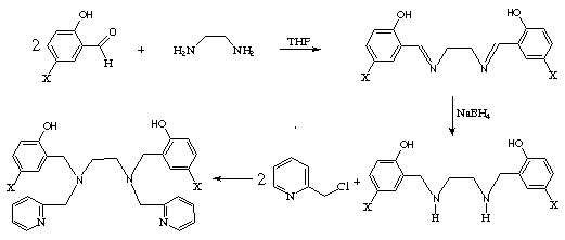 Os ligantes foram sintetizados de acordo com o seguinte esquema reacional (onde X = CH3, H, Br, NO2):