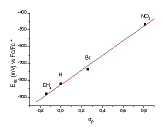 Os voltamogramas cíclicos dos complexos foram medidos em um potenciostato/galvanostato PAR 273, em acetonitrila contendo 0,1 mol.L-1 de TBAPF6, utilizando um sistema de 3 eletrodos sendo trabalho: Pt, auxiliar: Pt e referência: Ag/AgCl. Ferroceno foi utilizado com padrão interno. Em todos os compostos observou-se a presença de uma onda reversível atribuída ao processo de transferência de um elétron: FeIII + 1 e- ® FeII. Os valores de E1/2 sofrem um deslocamento anódico na medida em que diminui o efeito doador e aumenta o efeito retirador de elétrons dos grupos substituintes. Pode-se observar na figura 1 uma correlação linear entre o parâmetro de Hammet sp e o E1/2, o que demonstra um efeito direto dos substituintes sobre a densidade eletrônica no centro metálico.