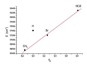 Os espectros de UV-Vis mostram uma banda na região de 500-600 nm, atribuída a um processo do tipo TCLM Oph ® FeIII. Outra banda pode ser observada em 324 nm, também atribuída um a processo de TCLM. Pode-se observar, através da figura 2, uma influência direta dos grupos substituintes na energia do processo de TCLM Oph ® FeIII, exceto para o complexo (2). Esse efeito pode ser explicado pela diminuição da densidade eletrônica sobre o anel fenólico na medida em que aumenta o efeito retirador dos grupos substituintes, que por conseqüência diminui a capacidade doadora do grupo fenolato dificultando o processo de TCLM.
