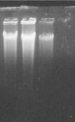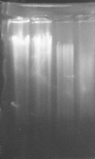 Como pode ser observado na figura 3 obteve-se uma nítida degradação do DNA cromossomial pelos compostos 1 e 2 nas concentrações de 1240 e 3750 mM para o composto 1 e 375, 1250 e 3750 mM para o composto 2. A partir destes resultados testes de mutagenicidade de Ames utilizando a bacteria Salmonella typhimurium serão realizados com ambos os complexos.