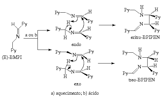 O mecanismo proposto neste trabalho, para a reação de acoplamento do (E)-BMPI catalisada por ácido, é semelhante às reações ene imino do tipo Mannich.(1) O mecanismo destas reações de Mannich, pode ocorrer de duas maneiras: (i) intramolecular, a mais comum, ocorre tanto em iminas ativadas como desativadas; (ii) intermolecular, observado somente em iminas ativadas possuindo grupos tosila e acetato na presença de ácidos de Lewis.2 Ao contrário, neste trabalho os dados apresentados mostram que para a reação de acoplamento do (E)-BMPI na síntese dos diastereoisômeros treo e eritro-BPIPEN, com substituinte desativante do tipo piridila, observou-se um mecanismo ene imino intermolecular. Este é o primeiro exemplo de reação ene imino intermolecular com grupos desativantes. Os resultados obtidos comprovam a presença dos intermediários eritro e treo-BPIPEN através da técnica de ressonância magnética nuclear de próton.