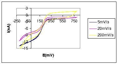 Os voltamogramas cíclicos obtidos demonstraram que a taxa de eletrólise não excede a taxa de difusão do analito. Ou seja, o voltamograma assume a forma de uma curva sigmóide, conforme esperado para os ultramicroeletrodos. Na figura 1 está apresentado o voltamograma cíclico para uma gota de solução 4,3mM de ferricianeto de potássio a diferentes velocidades de varredura.
