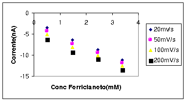 Foram testadas as velocidade de varredura de 20, 50, 100 e 200mV/s para soluções de 0,5; 1,5; 2,4 e 3,4mM ferricianeto de potássio em células eletroquímicas de 15mL e em gotas cujo volume era de aproximadamente 20mL. Na figura está apresentada a corrente catódica medida em um potencial de 10mV. Esses testes demonstraram que a intensidade de corrente de catódica está linearmente correlacionada com a concentração de ferricianeto de potássio, sendo que o índice de correlação e o parâmetro angular da reta interpolante diminuem à medida que a velocidade de varredura aumenta. Os parâmetros angulares das retas interpolantes variam de 2,63 até 2,41nA/mM para as velocidades de 20 e 200mV/s, respectivamente.