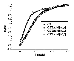 A sorção de vapor de água foi analisada com base na Equação 1, onde Mt denota a massa cumulativa sorvida, M¥ a massa sorvida no equilíbrio, t é o tempo e