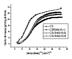 k e n são constantes.1 Quando a taxa de difusão é muito menor do que a taxa de relaxação (n=0,5) tem-se um transporte Fickiano do tipo I e quando a difusão é muito rápida comparada com a taxa de relaxação (n=1) tem-se um transporte Fickiano do tipo II. Sistemas não-Fickianos situam-se entre os tipos I e II, e n assume valores intermediários entre 0,5 e 1.2 Para o sistema estudado no presente trabalho o comportamento observado de acordo com a Equação 1 é mostrado na Figura 1 e os valores de n calculados são apresentados na Tabela 1. Os valores de n, demonstram que o filme de CS apresenta uma difusão não-Fickiana ou difusão anômala. Os filmes com presença de sorbitol (CS/Sorbitol: 1/0,1 e 1/0,2) tendem a uma difusão Fickiana do tipo II e o filme CS/Sorbitol (1/0,3) apresenta difusão Fickiana do tipo II. Na Figura 2 são mostradas as curvas de sorção como percentual de ganho de massa de vapor de água versus a raiz quadrada da razão tempo/área, apresentando um formato sigmoidal. O valor de t/L2 para qual Mt / M¥ = 0,5 pode ser convenientemente escrito como (t/L2)1/2 (tempo de meia- vida) e o coeficiente