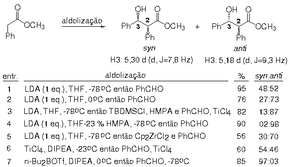 Enquanto o uso de THF-HMPA (entrada 4) é uma boa alternativa para a preparação de anti-aldóis, o n-Bu2BOTf mostrou-se um excelente reagente para o acesso a syn-aldóis em altas seletividades a partir de fenilacetatos, constituindo-se em um método complementar ao uso do c-Hex2BI descrito por Ganesan e Brown.3