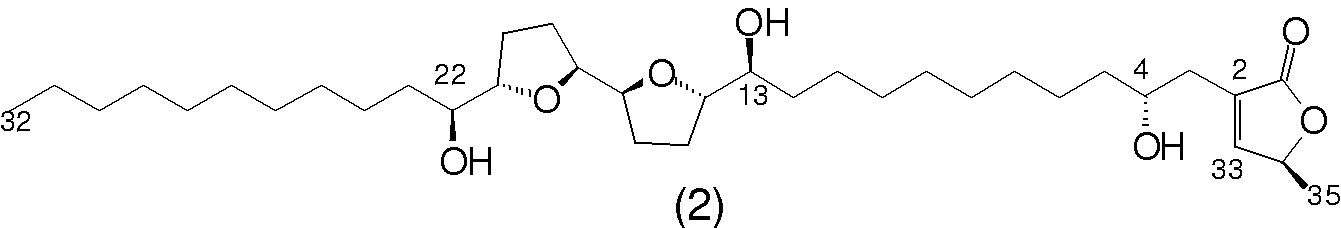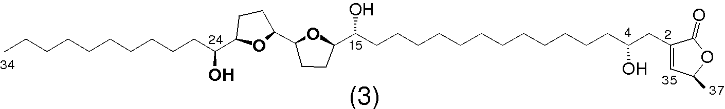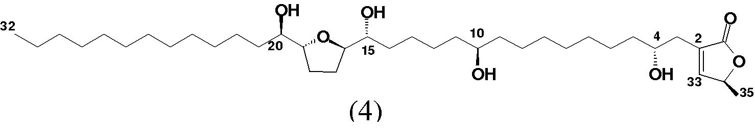 Abreo, M. J. and Sneden, A. J. . 4-hydroxy-25-desoxyneoraelinicin, a new bistetrahydrofuranoid acetogenin from Rollinia papilionella. J. Nat. Prod., 52, 822-828, (1989).