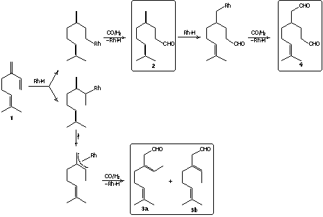 A velocidade de hidroformilação diminui à medida que a dupla olefinica torna-se mais substituída. A reação da dupla ligação com o complexo metal-hidreto produz dois complexos metal alquila sendo um linear e o outro ramificado. O primeiro, após carbonilação e hidrogenólise resulta no aldeído 2. A dupla ligação 1,1-dissubstituída deste aldeído sofre hidroformilação nas condições reacionais, resultando o produto 4. A partir do complexo metal alquila ramificado ocorre a formação de um intermediário p-alílico. Neste intermediário, a carbonilação se produz quase exclusivamente sobre a posição alílica terminal. Dependendo do ligante auxiliar de fósforo a reação produz majoritariamente os aldeídos 2 e 4 ou os aldeídos 3a e 3b. Por exemplo, utilizando o ligante fosforado BIPHEPHOS formam-se principalmente os aldeídos 3a e 3b. E ao se empregar o ligante fosforado XANPTHOS, se forma os aldeídos 2 e 4. Com o ligante fosforado BISBI a conversão completa do mirceno ocorre em menos de 24 horas e se obtém 75% dos aldeídos 3a e 3b. Exceto no sistema catalítico onde se empregou o ligante fosforado P(OPh*)3, todos os outros ligantes utilizados mostraram-se muito eficientes na conversão do mirceno em aldeídos. A pouca atividade deste fosfito pode estar relacionada à formação de um complexo estável com o intermediário p-alilico.