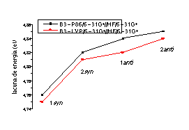 (S-VWN), GGA (B-LYP) e híbrida (B3-P86 e B3-LYP), geometria RHF/6-31G*.
