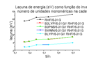 Pretendemos estabelecer relações claras de condutividade entre olígômeros derivados dos hexiltiofenos, com um número crescente de unidades monoméricas, para corroborar resultados experimentais e também para servir de guia para químicos sintéticos e cientistas de materiais, que tenham aplicações práticas na microeletrônica. Entretanto, a execução de cálculos apropriados no nível Ab Initio, com correlação eletrônica, dificultaria nossas tarefas, por isso optamos por calcular as geometrias no nível HF (Hartree-Fock) e posteriormente utilizar essa geometria para cálculos correlacionados usando a DFT (Teoria do Funcional de Densidade), nas aproximações local, GGA (aproximação do gradiente generalizado) e híbrida (o funcional de troca é oriundo do método de HF)1. A aproximação local foi dada pelo funcional S-VWN, a GGA pelo funcional B-LYP e a híbrida pelos funcionais B3P83 e B3LYP1. Para realizar nossos objetivos tomamos a lacuna de energia (banda de energia proibida) entre as bandas de condução e de valência como o valor em módulo da diferença entre os valores da afinidade eletrônica (AE = -ELUMO) e o potencial de ionização (PI = -EHOMO). Os valores calculados por nós da largura da lacuna de energia (entre as bandas de condução e de valência) são uma medida da condução no polímero condutor, e esses valores são normalmente apresentados como uma função do inverso do número de unidades monoméricas da cadeia. O método HF sempre superestima essa propriedade, acontecendo o mesmo com os métodos híbridos da DFT (B3-LYP e B3-P86), devido à contribuição de troca do método de HF. Em contrapartida os funcionais local (S-VWN) e GGA (B-LYP) apresentam resultados comparáveis aos experimentais para derivados não substituídos do tiofeno. É possível verificar que existe uma variação dos valores da lacuna de energia com o número de monômeros, demonstrando que os oligômeros com número par de unidades monoméricas são melhores condutores que as formas com número ímpar de unidades, fig.2.