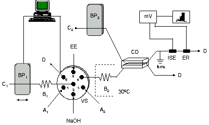 Figura 1. Sistema de análise por injeção seqüencial proposto para determinação de uréia e N-amoniacal. A1 e A2, amostra de leite e de silagem (900 e 150 ml, respectivamente); NaOH, solução 0,50 mol l-1 (300 ml); e EE, extrato enzimático (300 ml); C1 e C2 ,fluxos transportadores (H2O, 2,0 ml min-1 e tampão TRIS-HCl 1,0 ml min-1, respectivamente); B1 e B2, bobinas de reação (3 ml e 50 cm, respectivamente); BP1 e BP2, bombas peristálticas; VS, válvula seletora; CD, câmara de difusão gasosa; ISE, eletrodo tubular seletivo ao íon amônio; ER, eletrodo de referência e D, descarte.