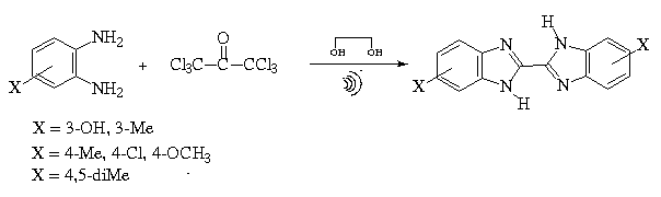 A reação de hexacloroacetona com excesso de 1,2-fenilendiaminas substituídas (3-metil-, 3-hidroxi-, 4-metil-, 4-cloro-, 4-metoxi- e 4,5-dimetil) foi realizada em etilenoglicol, entre 40-50°C, com a formação do correspondente bisbenzimidazol substituído, com bons rendimentos.