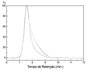 Figura 1: Cromatogramas dos copolímeros sintetizados: (---) térmico e (¾) fotoquímico. Proporção: 60% PVP. |