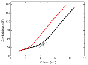 A medida de condutividade permite conhecer o número de cargas ou o número de grupos ácidos presentes na cadeia polimérica. As curvas resultantes da titulação condutométrica do copolímero térmico e fotoquímico (somente para a amostra 60% PVP) estão apresentadas na Figura 2. O volume de base e a condutividade da solução no ponto de equivalência são determinadas a partir da intersecção dos dois ramos da curva (Figura 2 - ponto A). O ponto de equivalência corresponde a neutralização total dos grupos carboxílicos presentes em solução. Os resultados das percentagens de grupos ácidos presentes nos copolímeros mostraram idêntica variação das proporções dos monômeros para os dois métodos de copolimerização empregados neste estudo. A incorporação de ácido metacrílico nos copolímeros variou entre 35 a 70%. Os resultados da análise elementar mostraram concordância com as composições determinadas por titulação condutométrica.