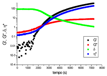 A figura 1 mostra a evolução temporal do módulo de estocagem (G), do modulo de perda (G), da viscosidade complexa (h*) e do ângulo de fase (d) para o híbrido siloxano-polipropilenoglicol contendo PPG de peso molecular 4000 g.mol-1. Podemos observar três períodos característicos: (i) Para t<1500s G" , apresenta valores maiores que G', revelando que o material possui as características de um fluído viscoso (ii) Para 1500s< t < 3000s, o aumento de G e da viscosidade h* é devido a formação e ao crescimento das particulas de siloxano localizadas nas pontas das cadeias de PPG, enquanto o aumento mais pronunciado de G' revela a formação progressiva de uma rede tridimensional (III) Para t>3000s os valores de G tornam-se maiores que de G , revelando que o gel apresenta um caráter essencialmente elástico : o gel é formado por uma rede tridimensional de cadeias de PPG interconectadas pelas partículas de siloxano.