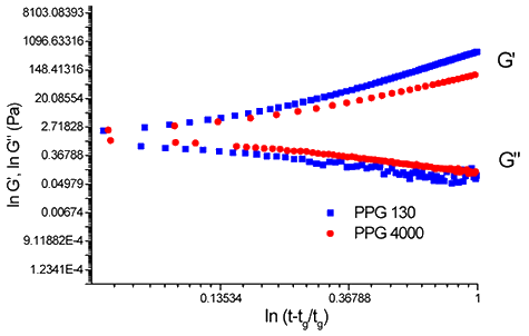 Figura 2: Dependência de (G) e (G) com (t-tgel)tgel para os híbridos contendo PPG de peso molecular 4000 e 130 , obtidos por catálise ácida. Os coeficientes lineares (expoentes críticos) obtidos são m=1,65 e k = 0,74.
