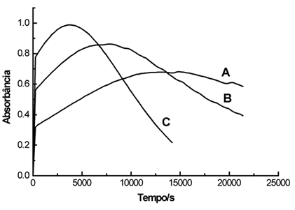 isolados de 1 mL cada, sendo possível efetuar a mistura das soluções antes das medições. Utilizando-se água como branco, as soluções foram misturadas por agitação e a absorbância na faixa espectral de 300-700 nm monitorada por 6 horas a intervalos regulares de 240s empregando-se um espectrofotômetro HP 8453 diode-array dotado de amostrador múltiplo Multicell. A utilização do amostrador múltiplo Multicell permitiu que até cinco diferentes soluções fossem monitoradas simultaneamente.